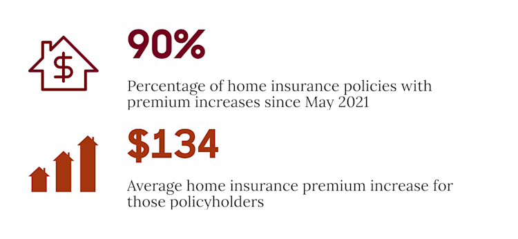 From May 2021 to May 2022, 90% of homeowners saw their quoted annual premium increase compared to the previous year. For homeowners whose premiums went up, the average increase was $134.